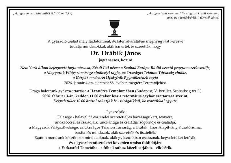 Mély megrendüléssel tudatjuk tagjainkkal és mindazokkal akik tisztelték, becsülték és szerették, hogy újságíró szervezetünk tiszteletbeli elnöke, Dr.Drábik János (1938-2025) 87 éves korában, ma délután elhunyt .